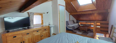 Au 2ème niveau vous arrivez dans une grande pièce (vélux avec store electrique) avec une partie chambre avec literie neuve en 160×200cm équipée d' une TV, et un deuxième salon pouvant servir de 2ème chambre avec son canapé lit.