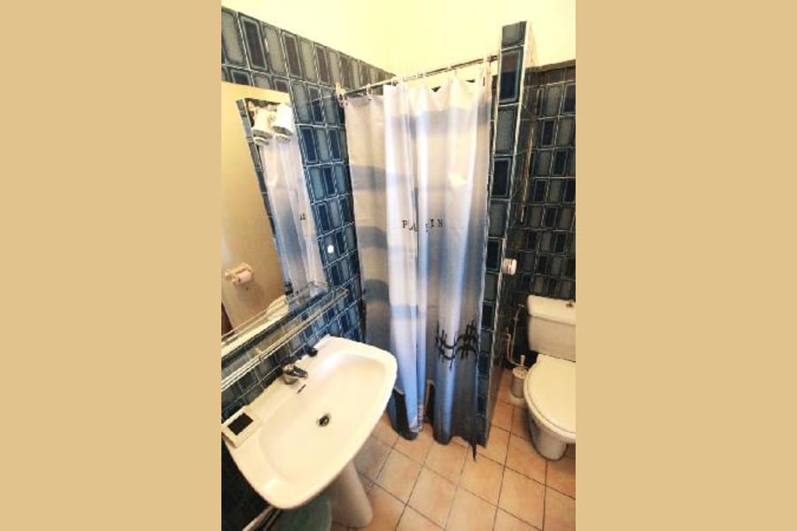 Une salle de bain avec douche, toilettes, lavabo, sèche cheveux, meuble de rangement, table et fer a repasser, séchoir tancarville.